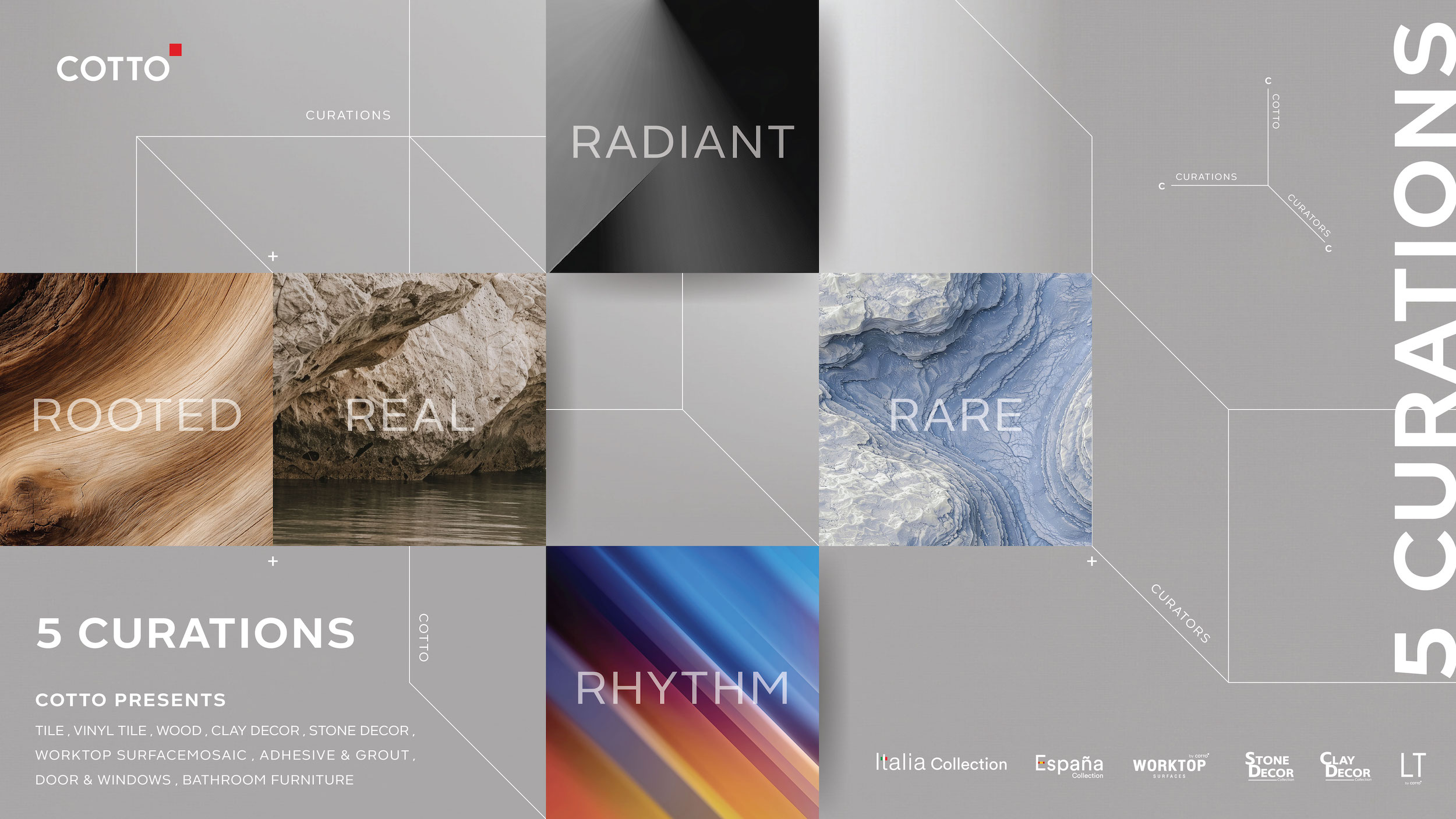 “5 CURATIONS” คือหัวใจสำคัญของงานสถาปนิก’69 ในปีนี้ โดย COTTO ได้จัดสรรกลุ่มวัสดุ 10 surface materials เพื่อให้นักออกแบบได้หยิบไปใช้งานร่วมกันได้จริง ครอบคลุมตั้งแต่ Tile, Vinyl Tile (SPC), Wood, Clay Décor, Stone Décor, Worktop, Mosaic, Grout, ไปจนถึง Door & Window และ Bathroom Furniture