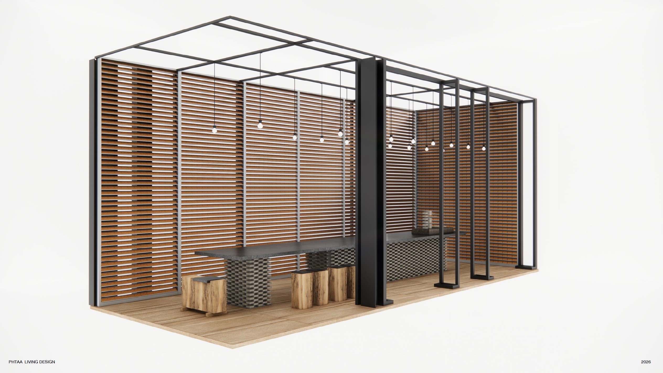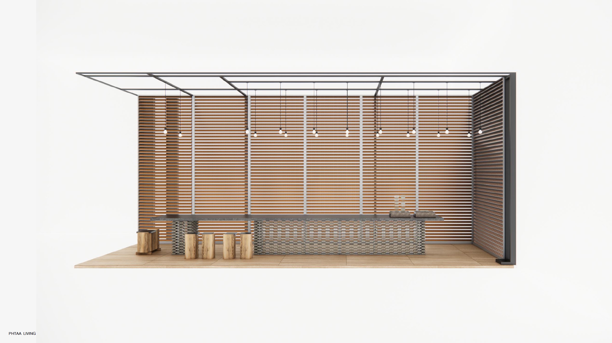 Specialty Café (Matcha room) ผลงานจาก PHTAA ที่เลือกหยิบ CURATIONS กลุ่ม Real วัสดุเอิร์ธโทน และ Rare หินสีพิเศษ รวมถึง “กระเบื้องด่านเกวียน” นวัตกรรมที่ COTTO ได้พัฒนาร่วมกับชุมชนด่านเกวียน จังหวัดนครราชสีมา จากการนำ Waste จากกระบวนการผลิตมาสร้างคุณค่าใหม่ สะท้อนถึงภูมิปัญญาชาวบ้าน ผสานกับความโมเดิร์นที่ถูกจัดเรียงในเป็น Façade เชื่อมโยงทั้งดีไซน์ และความยั่งยืนไว้ได้อย่างสมบูรณ์แบบ