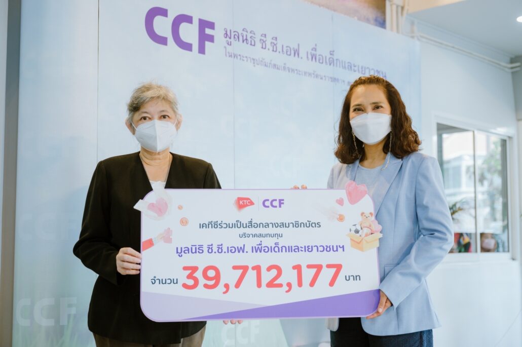 นางสาวสิรีรัตน์ คอวนิช (กลางขวา) ผู้อำนวยการ – การตลาดบัตรเครดิต “เคทีซี” หรือ บริษัท บัตรกรุงไทย จำกัด (มหาชน) เป็นตัวแทนมอบเงินจำนวน 39,712,177 บาท สมทบทุนให้กับมูลนิธิ ซี.ซี.เอฟ. เพื่อเด็กและเยาวชน ในพระราชูปถัมภ์สมเด็จพระเทพรัตนราชสุดาฯ สยามบรมราชกุมารี ซึ่งสมาชิกบัตรเครดิตเคทีซีได้ร่วมกันบริจาคผ่านช่องทางต่างๆ ของเคทีซี ทั้งการใช้คะแนนสะสม KTC FOREVER และการบริจาคผ่านบัตรเครดิตเคทีซี