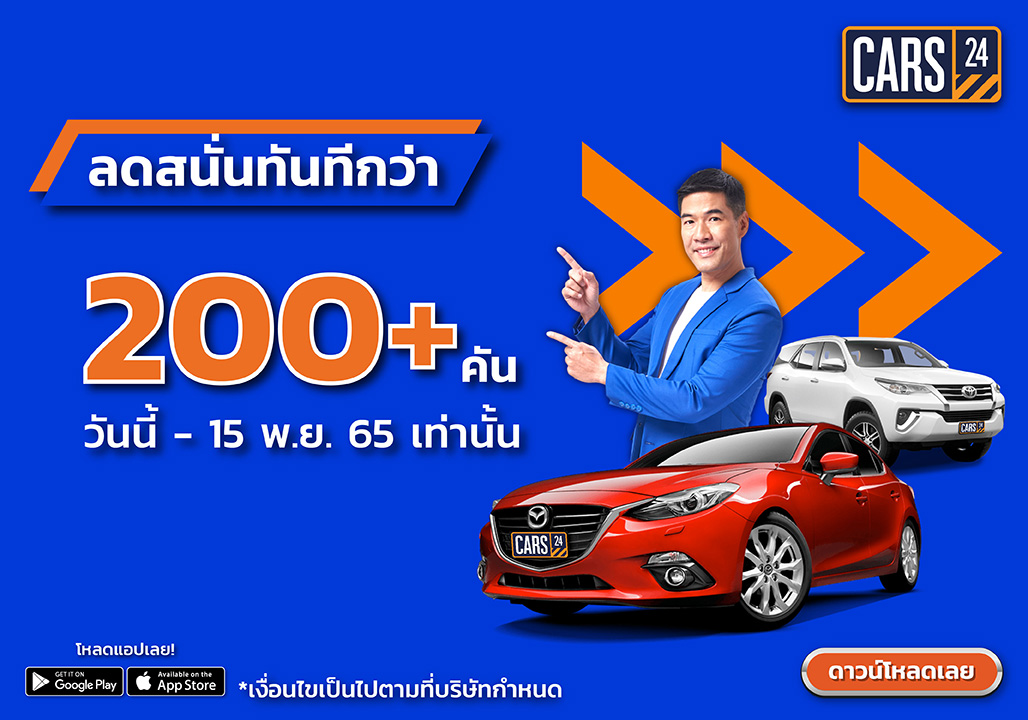 CARS24 (คาร์สทเวนตี้โฟร์) ศูนย์รวมรถมือสองออนไลน์เจ้าของฉายา “ยูนิคอร์นแห่งวงการรถมือสอง” คุณภาพระดับโลก ให้คุณซื้อ ขาย เทิร์น ครบจบในที่เดียว ส่งโปรโมชันเดือดช่วงปลายปีกับแคมเปญ “CARS24 ลดสนั่นทันที” เพิ่มความปังให้กับเดือนดีดีลโดน ด้วยส่วนลดสูงสุดกว่า 100,000 บาท* ตั้งแต่ วันนี้ – 15 พฤศจิกายน 2565 เท่านั้น!