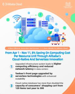 ของอาลีบาบา คลาวด์ ระบบโครงสร้างพื้นฐานที่ได้รับการอัปเกรดนี้ ช่วยเพิ่มประสิทธิภาพมหาศาลให้กับการประมวลผล การจัดเก็บ และเน็ตเวิร์กในดาต้าเซ็นเตอร์ต่าง ๆ ที่รองรับปริมาณงานในช่วง 11.11 และช่วยลดระยะเวลาในการตอบสนองของเน็ตเวิร์กควบคู่กันไปด้วย เช่น การอัปเกรดใหม่นี้ใช้เทคโนโลยี คลาวด์-เนทีฟ (cloud-native) ช่วยให้การสั่งซื้อ การชำระเงินให้ครบจากสินค้า pre-sale และการคืนเงิน สามารถทำได้ในเวลาเดียวกัน ด้วยความสามารถในการปรับขนาดได้มากขึ้นและระยะเวลาในการตอบสนองที่เร็วขึ้น
