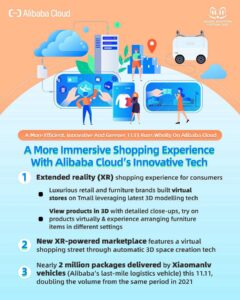 การปฏิสัมพันธ์อีกหนึ่งรูปแบบที่เกิดขึ้นใหม่มาจากมาร์เก็ตเพลสที่ขับเคลื่อนด้วย XRบน Tmall และ Taobao มาจากถนนช้อปปิ้งเสมือนจริงที่สร้างขึ้นด้วยการใช้เทคโนโลยีในการสร้าง automatic 3D spaceจากสถาบันวิจัย DAMO Academy ของอาลีบาบา โดยมีผลิตภัณฑ์มากกว่า 700 รายการ จาก 70 แบรนด์ อยู่บนถนนสายนี้ รวมทั้งแฟรนไชส์ที่ได้รับการยอมรับในนานาประเทศ 30 แห่ง เช่น Hello Kitty ซึ่งเป็นสัญลักษณ์ของ Sanrio และ Minions ซึ่งเป็นแฟรนไชส์ของ Hollywood นักช้อปทั้งหลายยังสามารถเลือกรูปอวาตาของตนเอง ตรวจสอบสินค้าและเพิ่มสินค้าเหล่านั้นไว้ในตะกร้าช้อปปิ้งเสมือนจริงของตนได้