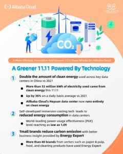 เท่าของปีที่ผ่านมา ในมหกรรม 11.11 ปีนี้ อาลีบาบา คลาวด์ ใช้ไฟจากพลังงานสะอาดมากกว่า 32 ล้านกิโลวัตต์-ชั่วโมง เป็นการใช้พลังงานสะอาดเพิ่มขึ้น 30% ต่อวันโดยเฉลี่ยเมื่อเทียบกับปีที่แล้วนอกจากนี้ ในปัจจุบัน ดาต้าเซ็นเตอร์ Heyuan ของอาลีบาบา คลาวด์ ซึ่งเป็นไฮเปอร์-สเกล ดาต้าเซ็นเตอร์ที่ใหญ่ที่สุดของบริษัทคลาวด์ในประเทศจีนตอนใต้ ใช้พลังงานสะอาดทั้งหมด เทคโนโลยี immersioncooling