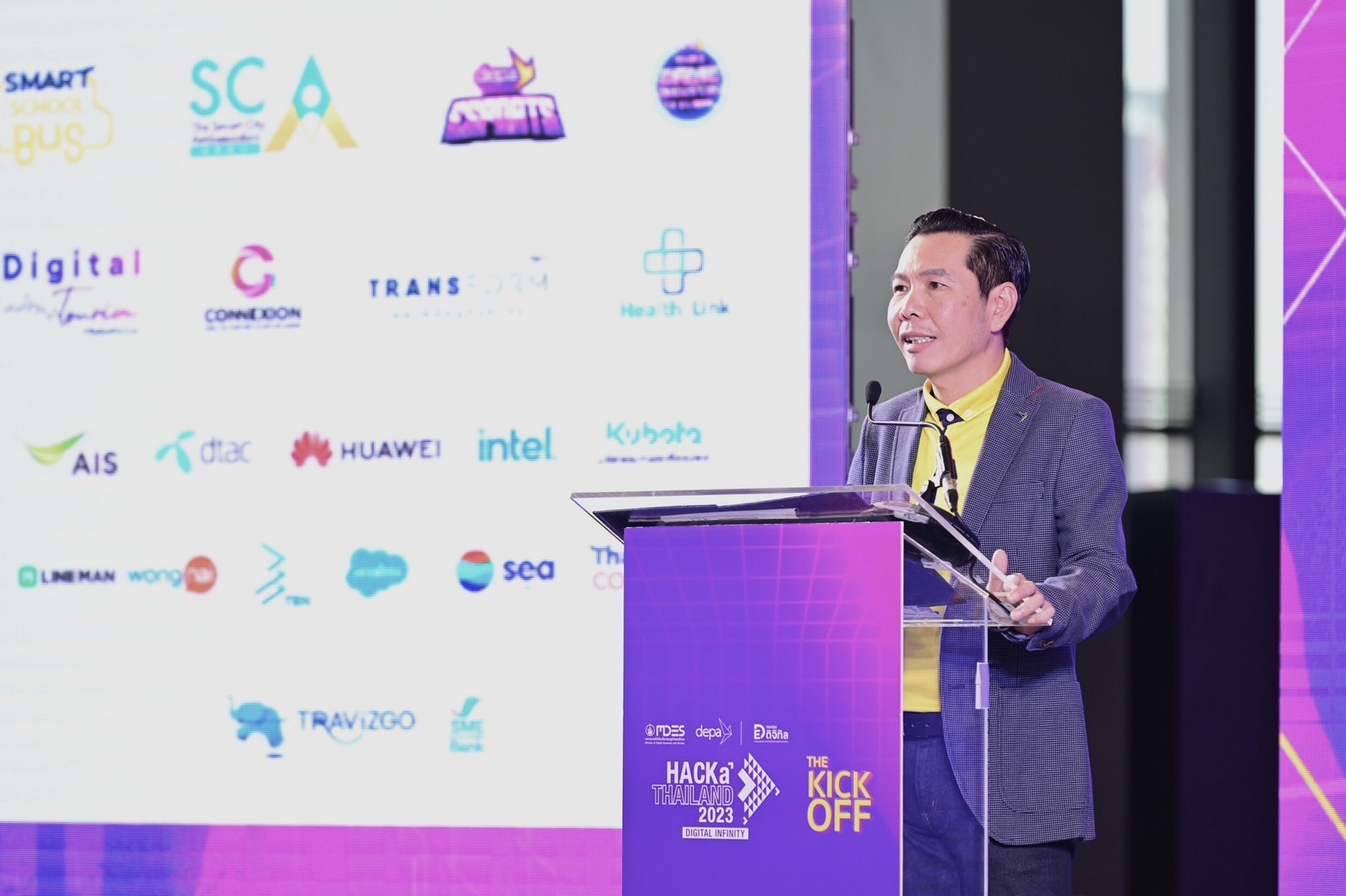 นายชัยวุฒิ ธนาคมานุสรณ์ รัฐมนตรีว่าการกระทรวงดิจิทัลเพื่อเศรษฐกิจและสังคม (ดีอีเอส) เป็นประธานในพิธีเปิดกิจกรรม HACKaTHAILAND 2023 #TheKickOff ภายใต้แนวคิด DIGITAL INFINITY: ดิจิทัลไม่มีที่สิ้นสุด โดยมี ผศ.ดร.ณัฐพล นิมมานพัชรินทร์ ผู้อำนวยการใหญ่ สำนักงานส่งเสริมเศรษฐกิจดิจิทัล หรือ ดีป้า ผู้แทนจากสถานทูต ผู้บริหารและผู้แทนจากเครือข่ายพันธมิตรภาครัฐ ภาคเอกชน และสถาบันการศึกษา ร่วมในพิธีโดยพร้อมเพรียง ณ ชั้น 9 SIAMSCAPE