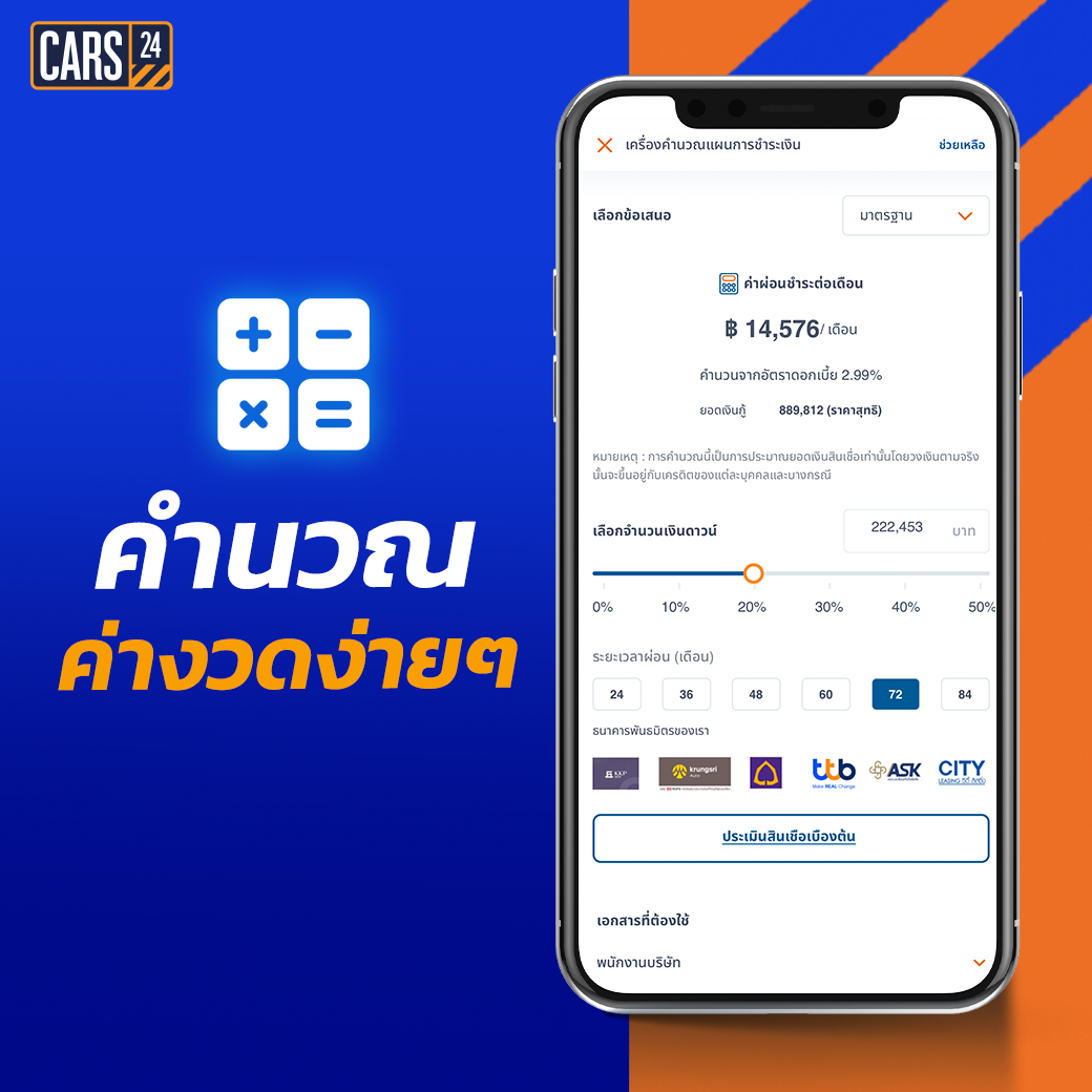 ผู้ที่สนใจสามารถเช็กตารางผ่อนดาวน์ คำนวณค่างวด และจองคิวทดลองขับได้ที่แอปพลิเคชัน CARS24 ดาวน์โหลดได้แล้ววันนี้ ทั้ง App Store และ Google Play Store หรือคลิก https://apple.co/36P0qWb ดูรายละเอียดเพิ่มเติมไที่เว็บไซต์ https://bit.ly/3sRR4QG หรือติดตามข้อมูลที่เพจเฟซบุ๊ก www.facebook.com/cars24th หรือแอดไลน์ @cars24th