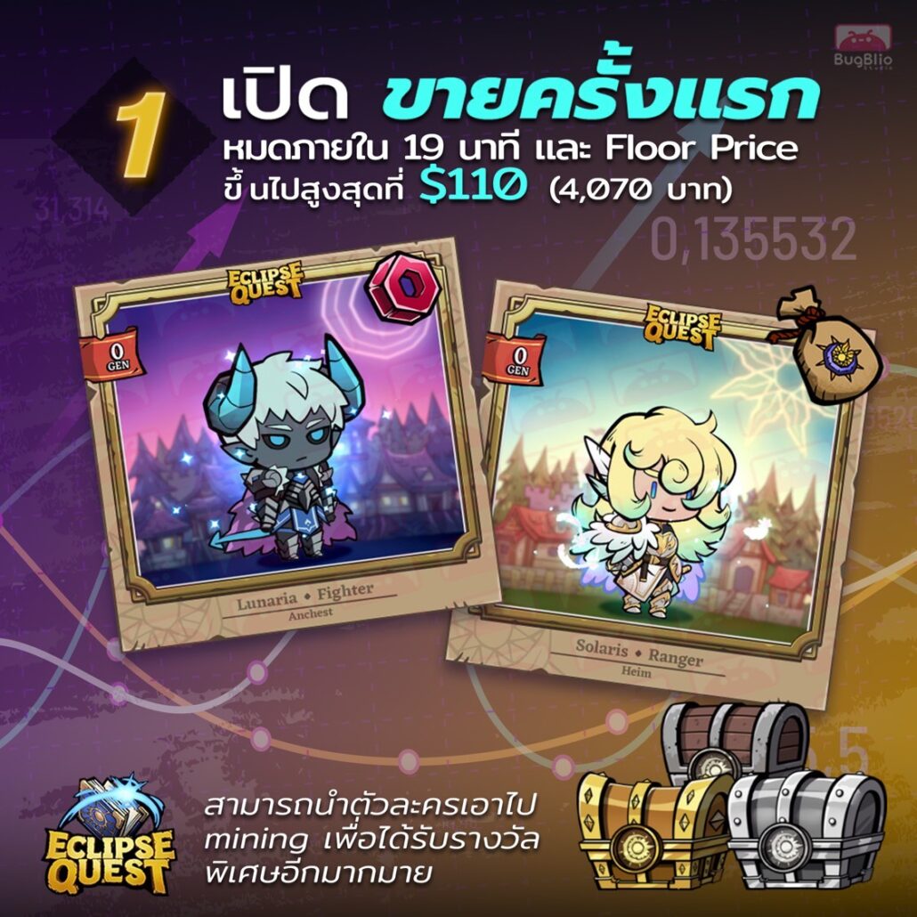 Eclipse Quest เปิดขาย Summoning Book รอบแรกไปหมดภายในเวลา 19 นาที โดยเปิดขายไปเมื่อวันที่ 8 กันยายนที่ผ่านมา บน Freecity และ Floor price ได้ขึ้นไปสูงสุดอยู่ที่ $110 (4,070 บาท) อีกทั้งยังสามารถนำตัวละครไป mining เพื่อรับรางวัลพิเศษได้อีกมากมาย